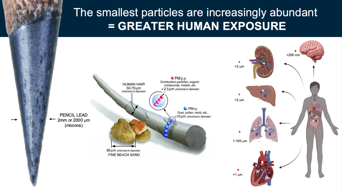 Plastic fragmenting into microplastics (1-5 μm) and nanoplastics (<1 μm) is one of the many sources of micro and nanoplastics in our environment. This rapid fragmentation is making nanoplastics ubiquitous, thus increasing human exposure. Smaller than 1/100th the width of a human hair, these micro and nanoplastics can enter the human body through ingestion, inhalation, and even wiggle through the pores of your skin. Studies reveal that the smallest nanoplastics, in the sub-micron size class, are becoming common contaminants in human tissues and organs. These exposures are well documented, but identifying their impacts takes longer. While the science is still developing, what we have thus far is alarming.”